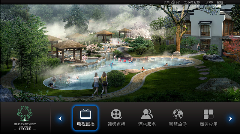 新聞來源:宏輝智通 發布日期:2015-11-29 瀏覽次數:10153"輝視"智能酒店互動視訊系統是為寬帶網上承載廣泛的VOD點播系統而提供的整套方案,采用“業務與承載分離、管理與服務分離”及“集中式管理、分布式服務” 架構思想、分層建議、分級管理,整個系統按功能主要分為五個層次:接入層、網絡承載層、媒體層、控制層、業務層,讓我們成為時代的酒店智能客房。廣西賀州溫泉酒店安裝“輝視”IPTV視訊系統